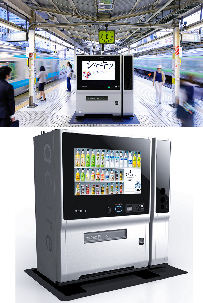 La société JR East Water Business Co., Ltd. a implémenté un nouveau type d’automate équipé d’un écran tactile de 47″, d’une caméra et de détecteurs permettant de déterminer avec une probabilité de + de 70% l’âge et le sexe d’un individu approchant de la machine, et de proposer ainsi une sélection parmi + de 30 produits disponibles, en fonction de la température, de l’heure et de la saison.