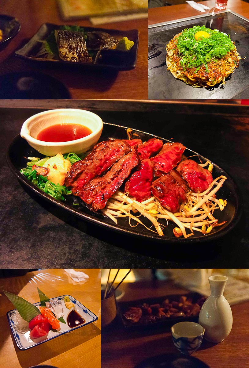 Les plats varient selon la spécialisation : yaki-tori (焼き鳥) -brochettes de volaille-, yaki-niku (焼き肉) -grillades de viande sur un grill à table-, sashimi (刺身) & sushi (寿司) – filets de poissons et crustacés crus et riz-, teppan-yaki (鉄板焼き) -grillades de viandes, poissons, légumes sur plaque de fer-, suki-yaki (すき焼き) -fondue de bœuf et de légumes-, okonomi-yaki (お好み焼き) -omelette grillée aux ingrédients variés-, pâtes soba (蕎麦) rāmen (ラーメン) ou udon (うどん).