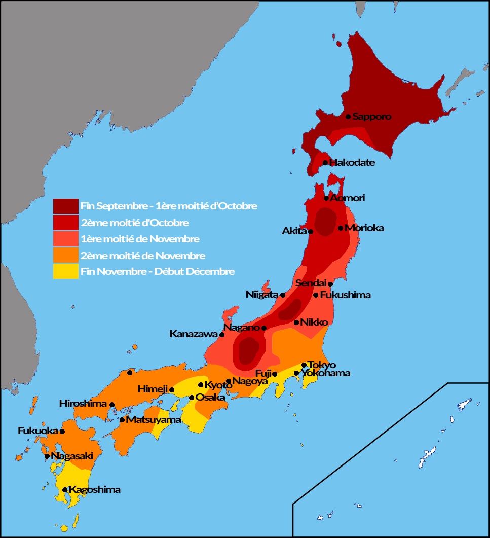 Le koyo s’étend sur une plus longue période que le hanami, débutant au mois de Septembre sur l’île d’Hokkaidō et progressant graduellement vers le Sud -à l’inverse de la vague de sakura (桜) remontant vers le Nord- pour se terminer dans les régions de Tokyo (東京), Kyoto (京都) et l’île de Kyūshū (九州) vers la fin Novembre ou début Décembre. Il est impossible de déterminer le moment idéal car il varie en fonction des températures des mois et semaines précédents, un décalage de quelques jours à 2 semaines, d’une année à une autre étant possible. Heureusement, le changement de couleurs – contrairement au sakura – peut être contemplé plusieurs semaines.